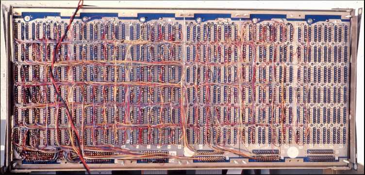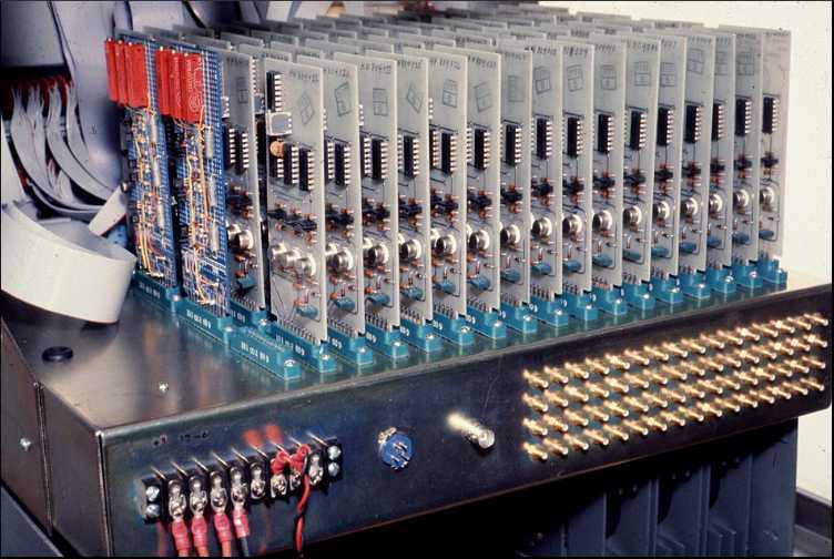 | This picture shows the wire-wraped coincidence circuit underside which was designed and wired at the Montreal Neuro. while the detectors were being made. Although the basic flow of this circuit was quite similar to the one we acquired from Brookhaven, it had to handle twice the number of detectors and had to be very much faster. I designed it, using mostly high speed Schottky TTL ICs which were just becoming common then. The wire wrapping was done by Janet Arts and Pat O'Reilly, two lab. technicians who worked for Dr Yamamoto. They had no previous electronics experience, but became pretty good at trimming the wire to the right length and making the right connections. To help debugging, and to make life more interesting for them I chose different colours of wire, and the colour corresponded to the resistor-value numerical colour code of the last digit of the signal name. Since the signals were more or less in order from each detector, this minimized the number of wires with the same colour which followed similar paths, making the wires much easier to follow. | Discriminator rack. The actual discriminator circuit boards were built and tested be Harshaw, but the mounting rack and wiring were made by George Lootus at the Montreal Neuro. The gold connectors to the right connected the preamplifiers on the detector ring to the corresponding discriminator. The grey ribbon cables at the left went to the front panel LEDs, the coincidence circuit and the numeric display. | George Lootus also wired up this front panel and had all the holes drilled. The red ring has 64 LEDs and the one corresponding to the crystal was lit each time a gamma ray was detected. The display showed the count-rate in kcps (or it could also show the address of the last two coincident crystals to help troubleshooting). When the count-rate was very low, (at background levels) one could see the individual LEDs wink on and off, but during a normal study, they all glowed fairly uniformly. If something went wrong, like a leak of the Kr-77 gas which the patients inhaled for blood flow studies, the upper LEDs glowed much more brightly than the rest. |